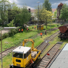 Witterungsbedingt fallen natürlich immense Mengen an Grünschnitt an. Um es uns ein wenig leichter zu machen, haben wir den gesamten Wagenzug der Mitteleinstiegswagen mal für ein paar Stunden verlagert. Endlich mal wieder eine Aufgabe für unsere Kö.
