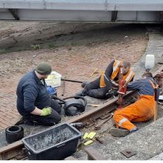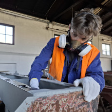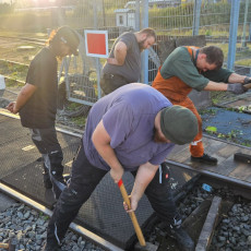Nachdem wir uns mit der Pflasterei im Vormonat leicht verausgabt haben, konnten wir uns wieder anderen Dingen zuwenden. Der Jung-Rangiertraktor unseres Vereinskollegen hat nur endlich wieder seine Puffer zurück, was das Verschieben des Fahrzeugs deutlich vereinfacht. Auf dem ehemaligen Fundament des Schlackekrans findet sich nun ein kurzes Gleisjoch, bereit zur Aufnahme des 01-Radsatzes. Unterdessen konnte auch der Packwagen weitestgehend von Müll befreit und eines der zerstörten Fenster erneuert werden.